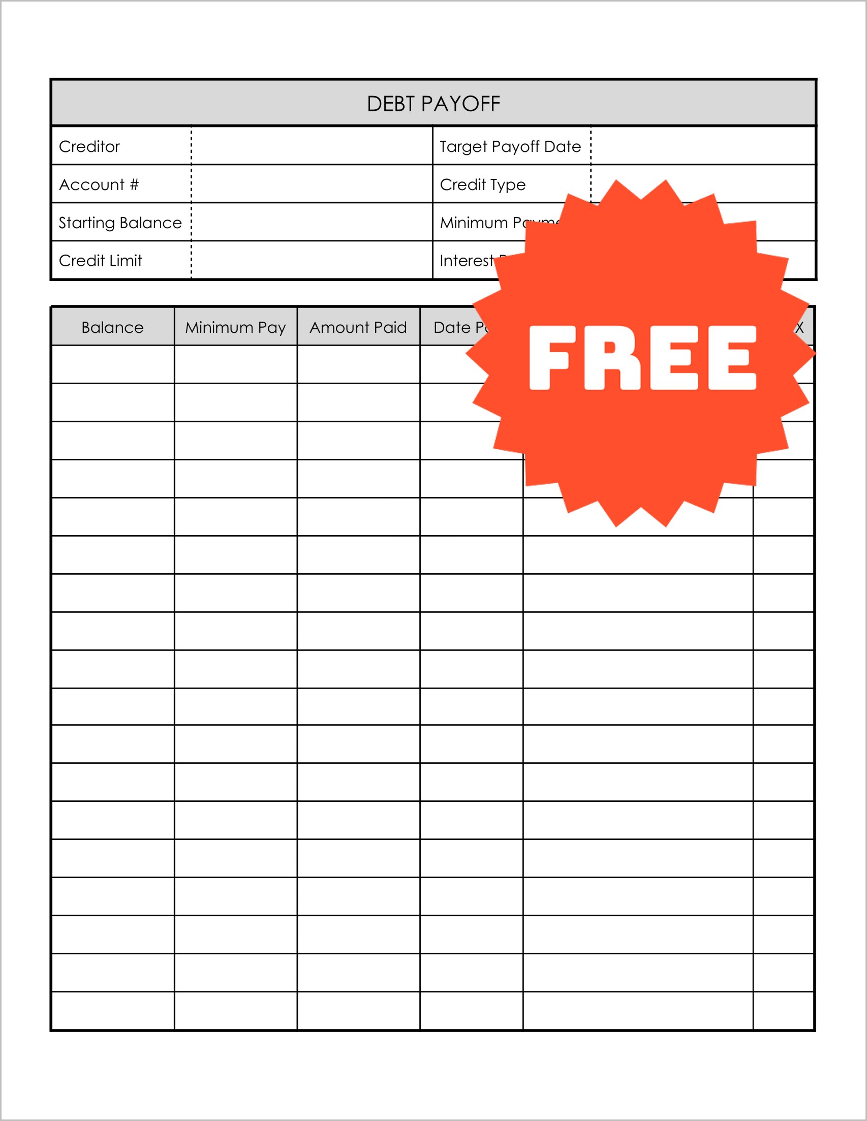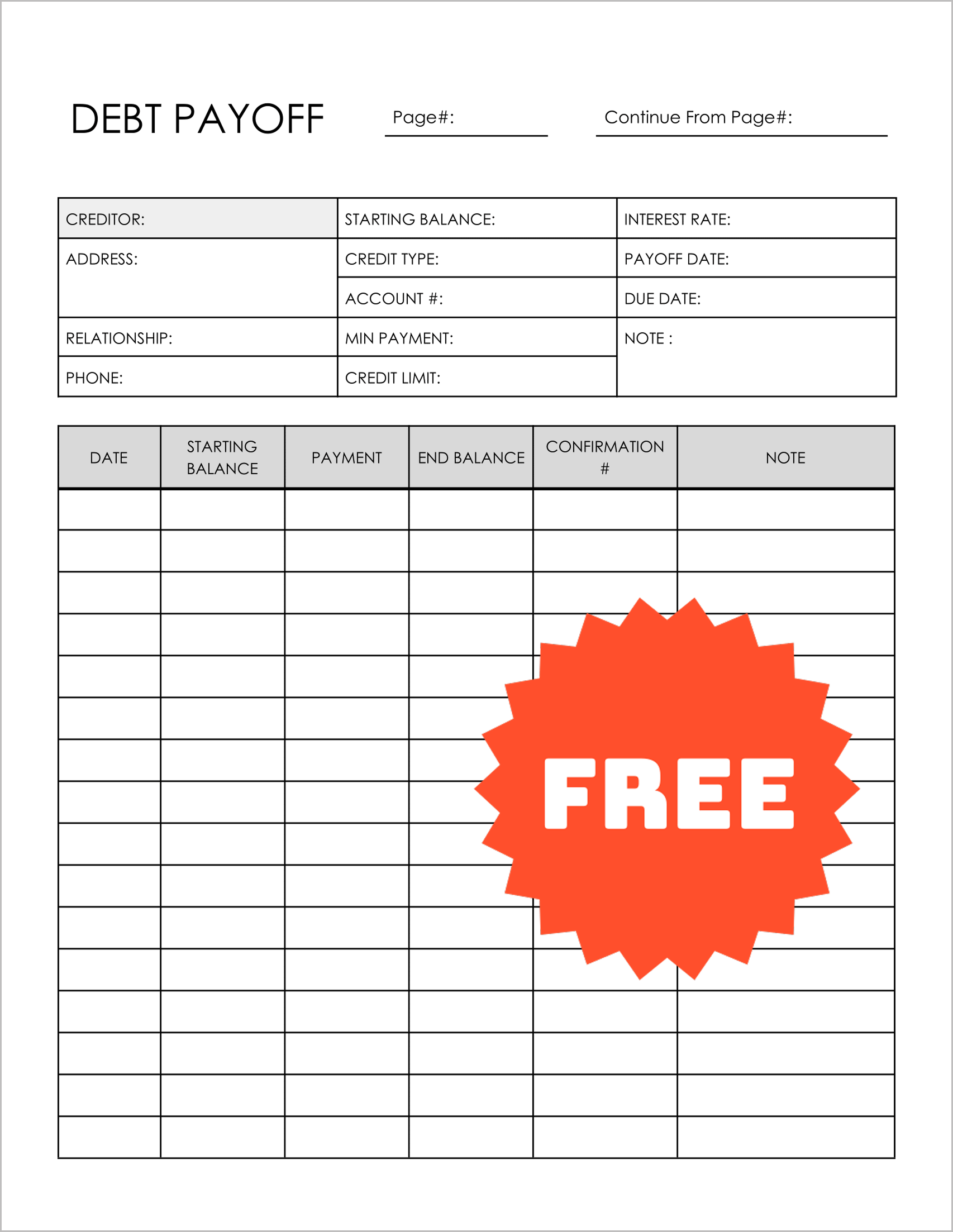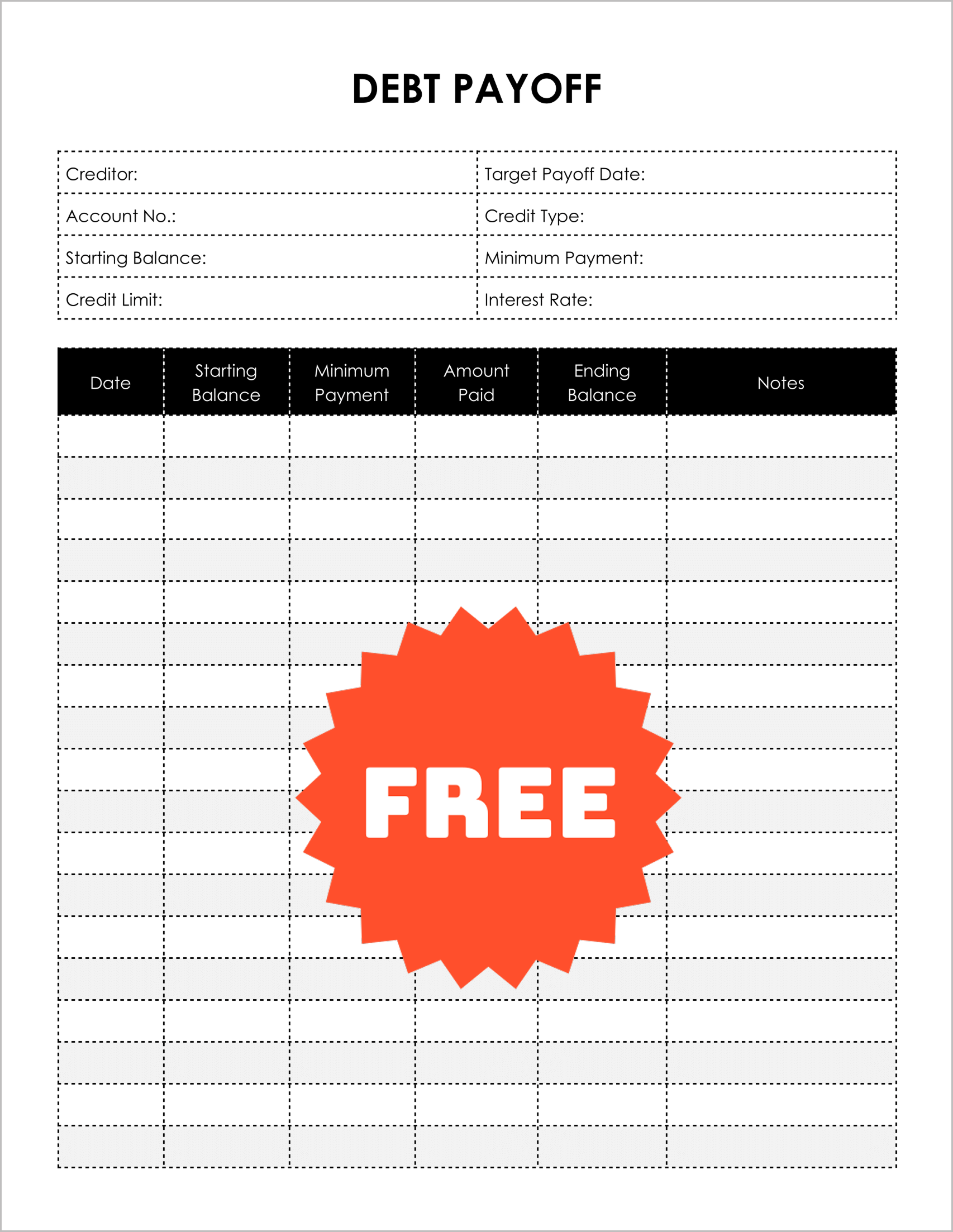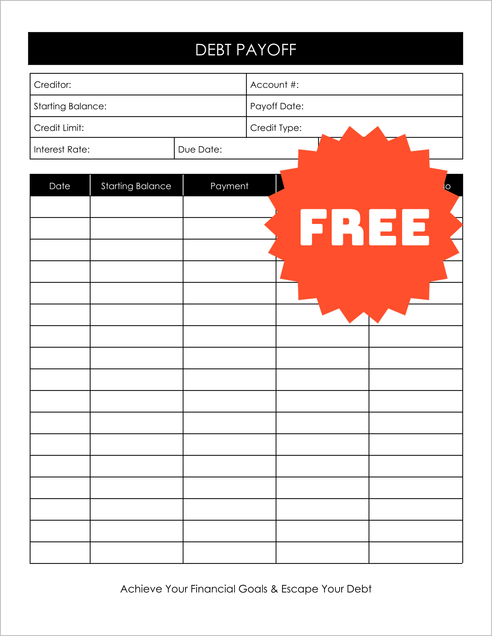 Before you pay a cent, you need to know exactly what you owe. This template acts as a comprehensive cover sheet. It forces you to log the Creditor, Account #, Starting Balance, and critical details like the Interest Rate and Credit Limit.