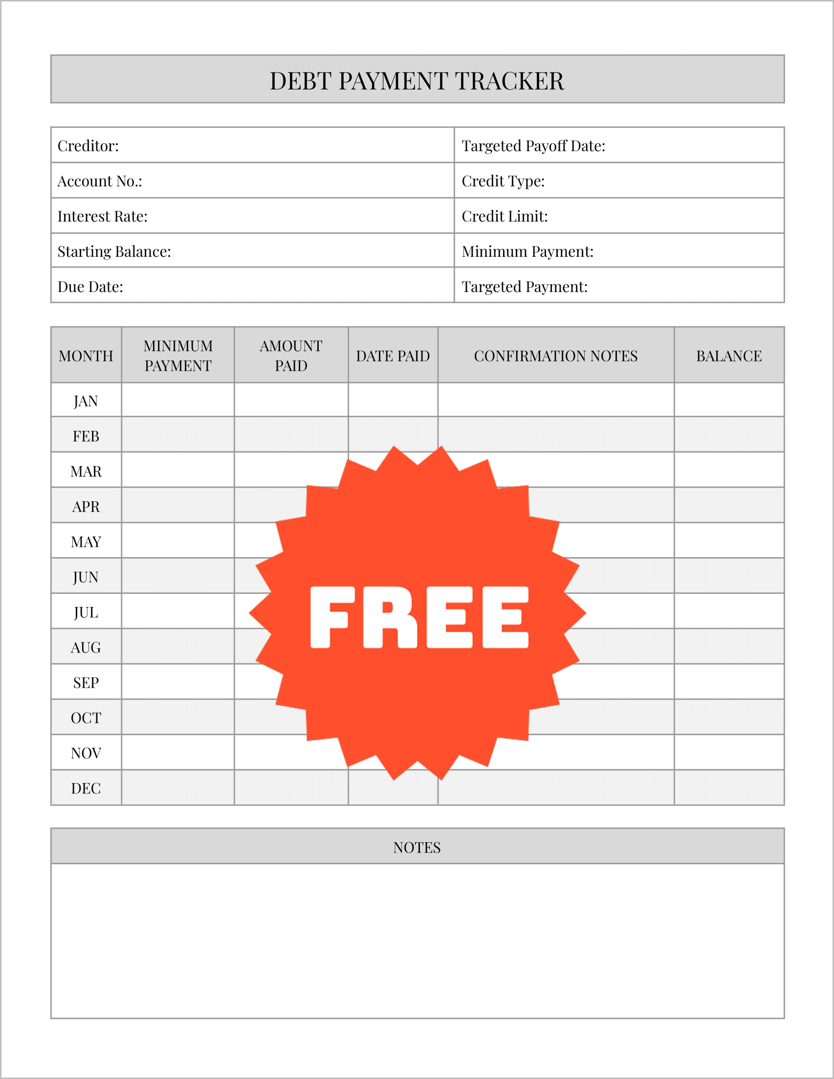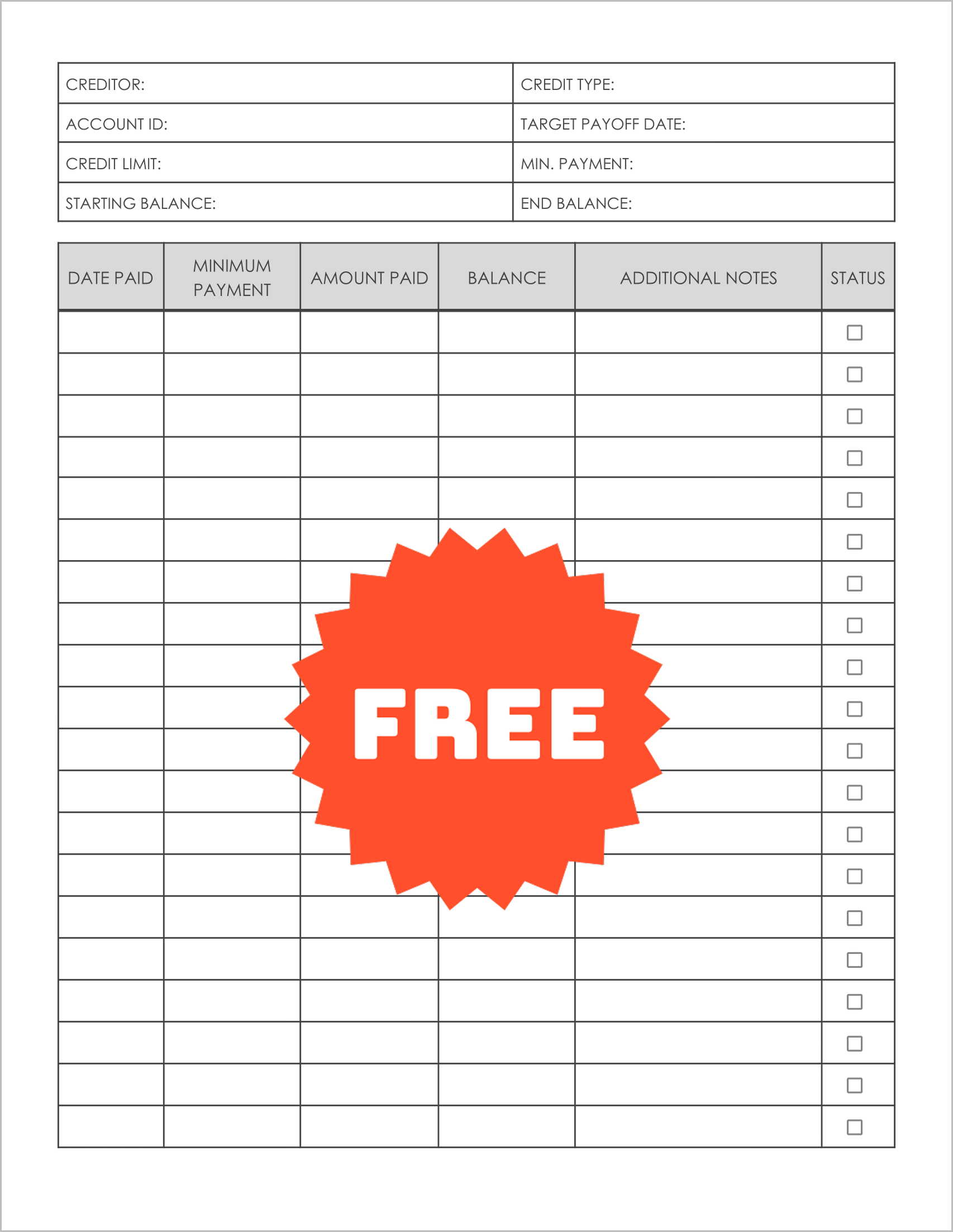 This template highlights the Credit Limit and Credit Type at the top of the page. By tracking your balance in relation to your limit, you can strategically lower your “credit utilization ratio”—a key factor in boosting your credit score while you pay down debt.